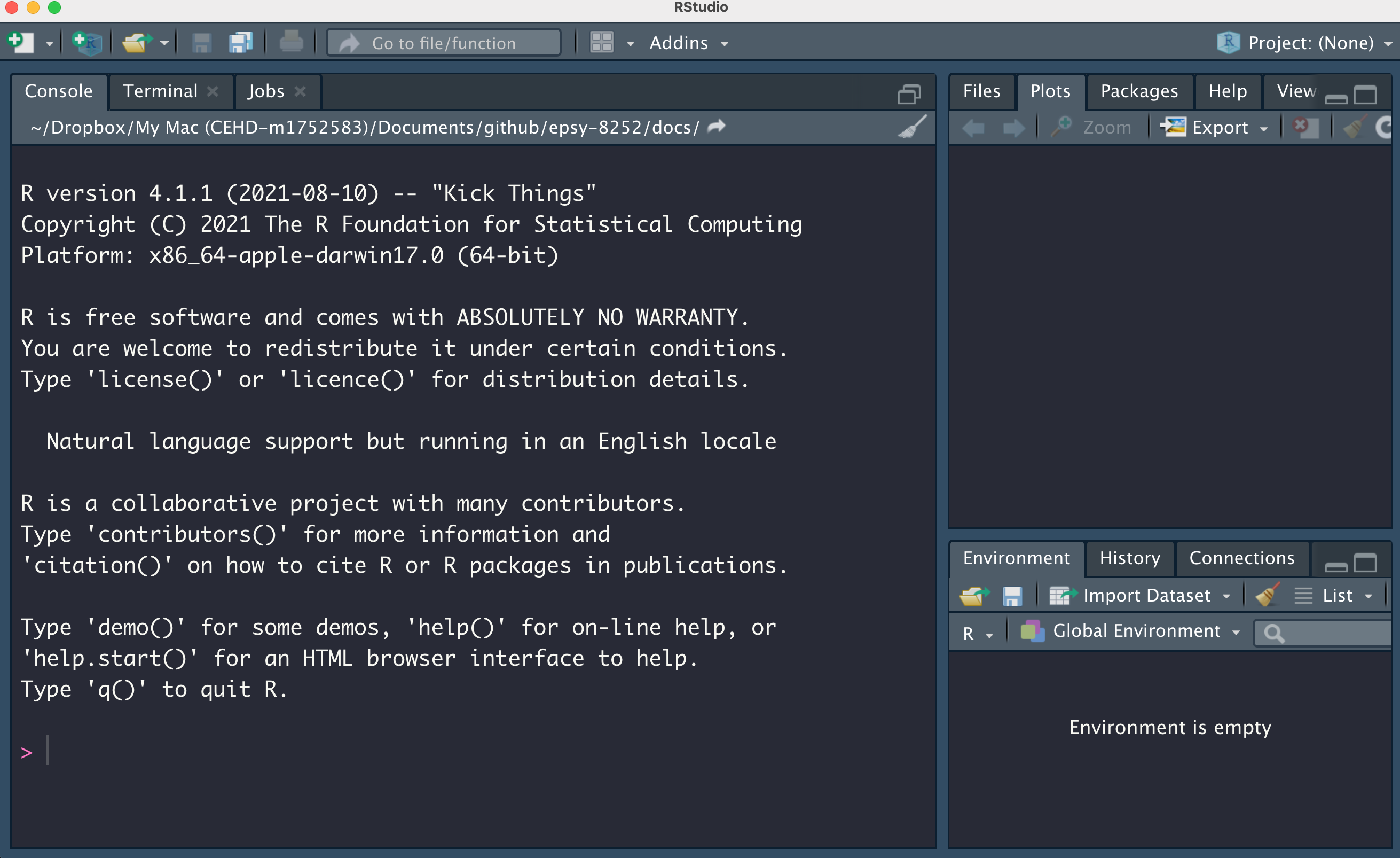 From your Applications or Programs folder, open the RStudio application. If you have successfully downloaded both programs, this should open the application and you should see a message indicating that you are using “R version 4.5.2” (or whichever version of R you installed) in the console pane.