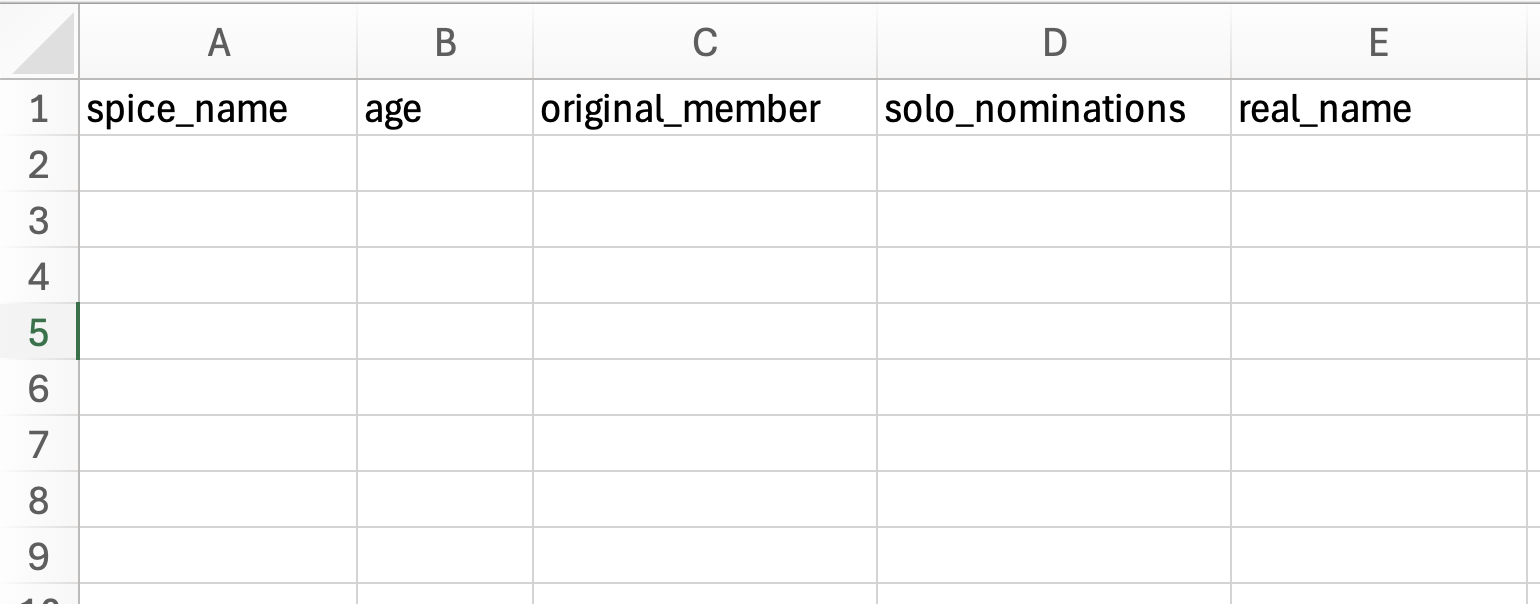 To mimic the Spice Girls data enter the following attribute names into the first row of your spreadsheet. Be sure to enter each attribute name into a separate column.