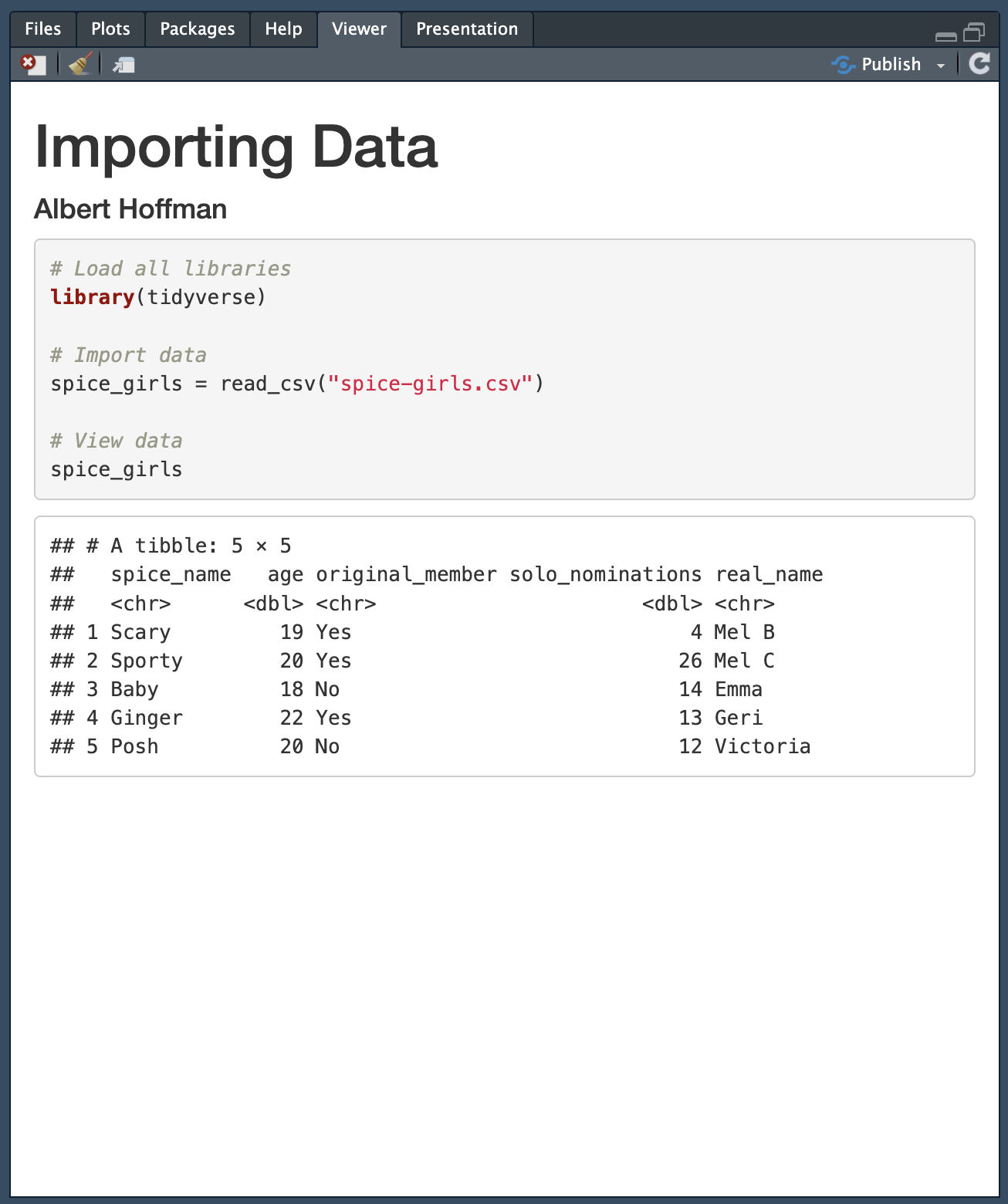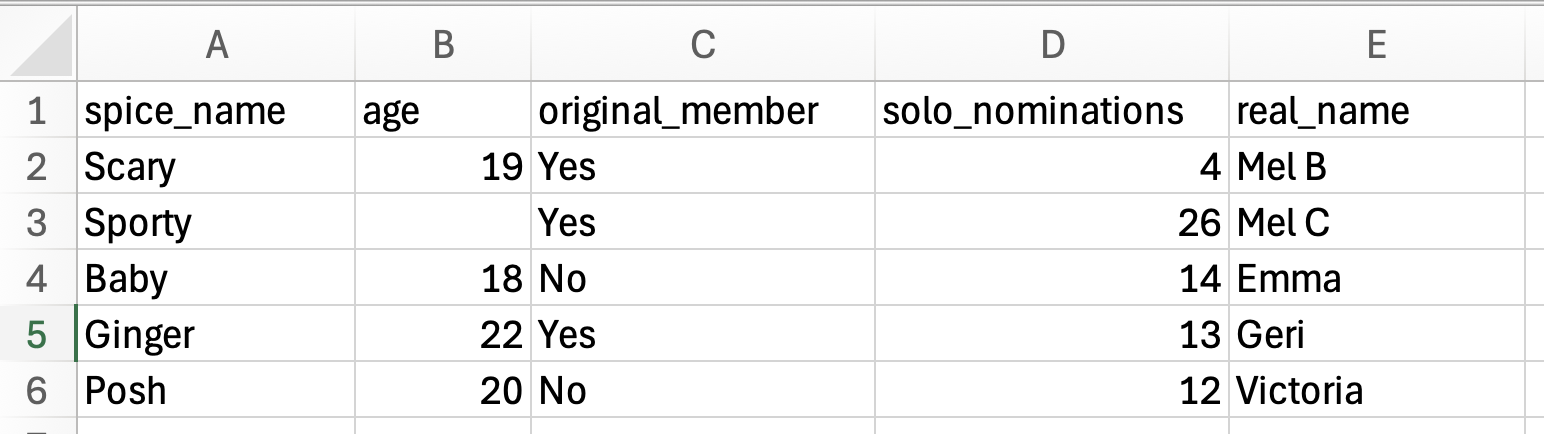 In this data, each row indicates a different Spice Girl (cases) and the five attributes include information (e.g., name, age, number of solo award nominations, and whether they were an original band member) about each of them. We are going to create a CSV file of these data and import that CSV file into a RMD document.