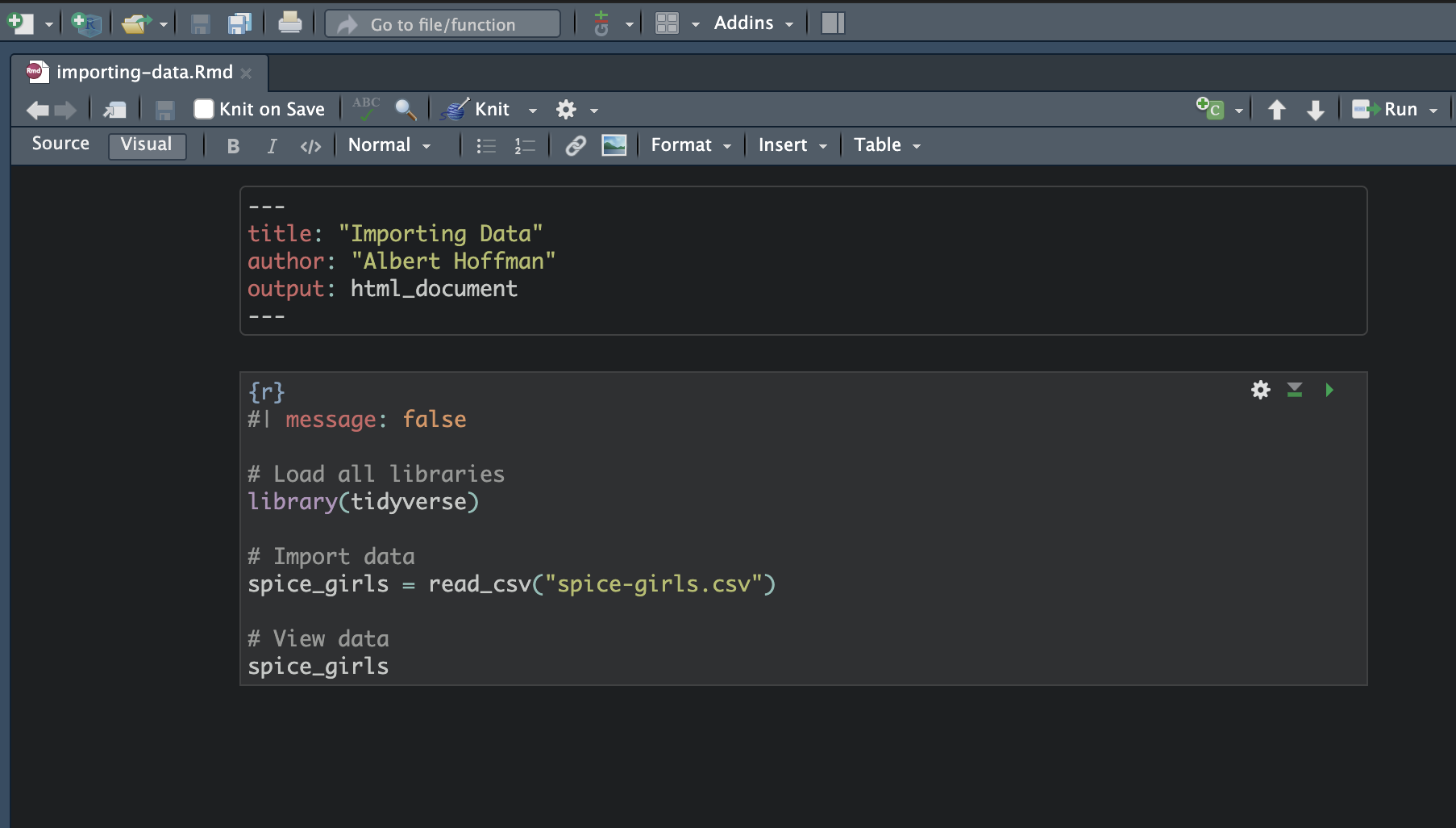 In your RMD file, create a new code chunk. This code chunk should be immediately after the YAML in your RMD file. This code chunk is your setup code chunk, and in it you will (1) load all the libraries you will need to use in the RMD document, and (2) import the data. The syntax you will enter into this chunk is as follows: