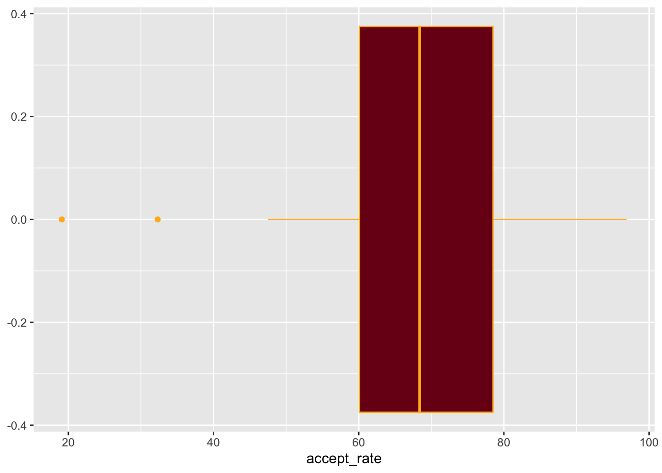 gf_boxplot(~accept_rate, data = mn, color = "#FFB71E", fill = "#7A0019")Exercises: Your Turn