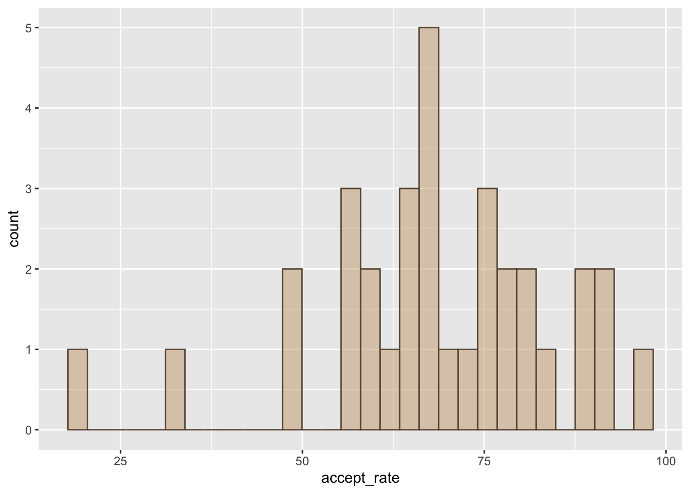- Use the mn-colleges.csv data to create a histogram of the acceptance rates. Color the interior of the bars using #CBA67B and the bar borders with #695645.