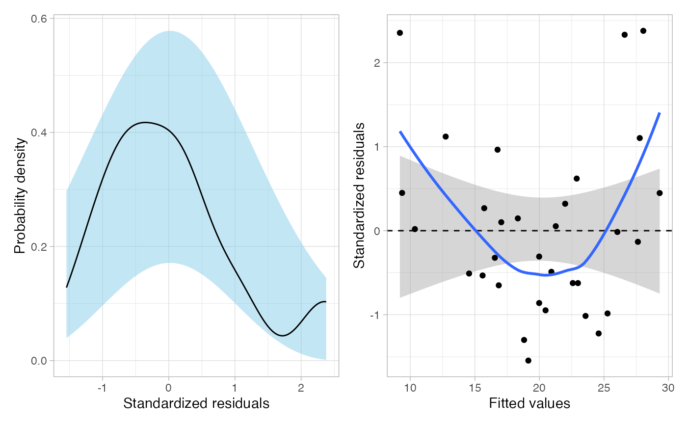 residual_plots(model, type = "b")One or more plots of the standardized residuals. In the density plot, a confidence envelope of reasonable values based on the normality assumption being true is produced along with the empirical density of the residuals. In the scatterplot of the standardized residuals versus the fitted values, a confidence envelope of reasonable values based on the mean residual = 0 (linearity) is produced along with the loess smoother based on the empirical data.