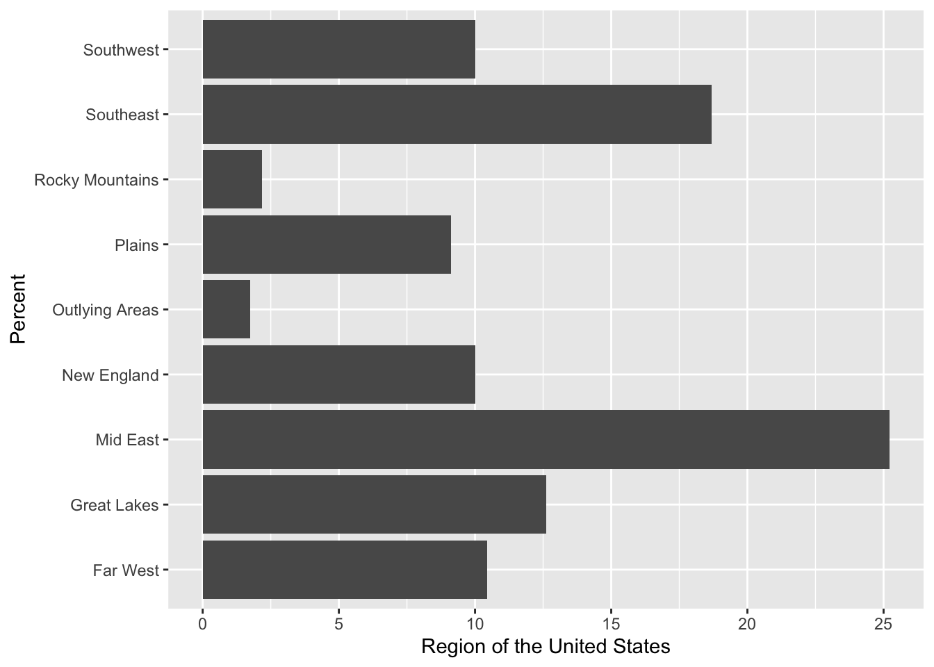To create horizontal bar charts we can use add on (literally) the function coord_flip() , to gf_counts(), gf_props() or gf_percents(). For example, to create a horizontal bar chart summarizing the counts of each type of institution we can use the following syntax: