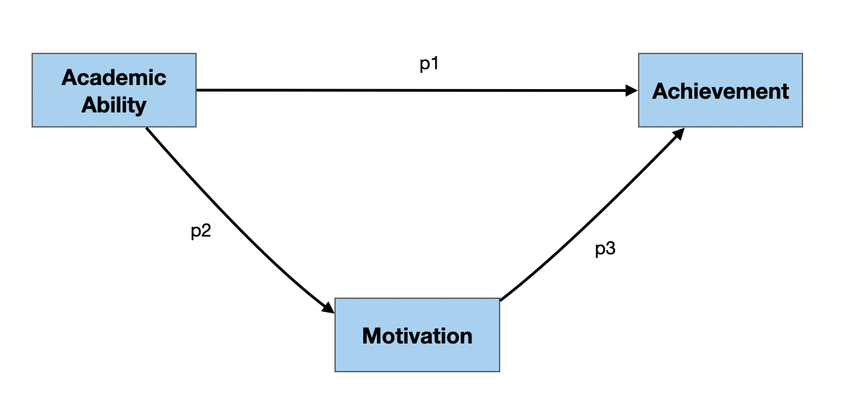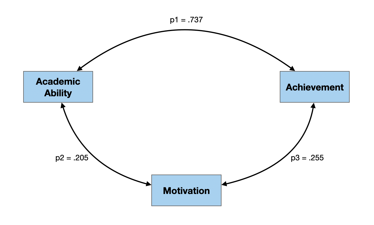 In both of the examples below, there are three manifest/measured variables (academic ability, motivation, and achievement) and three paths (p1, p2, and p3). The difference between the two is that in the right-hand diagram, there are hypothesized causal relationships, while in the left-hand diagram the relationships are not presumed to be causal.