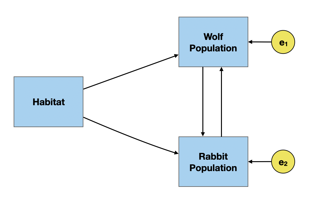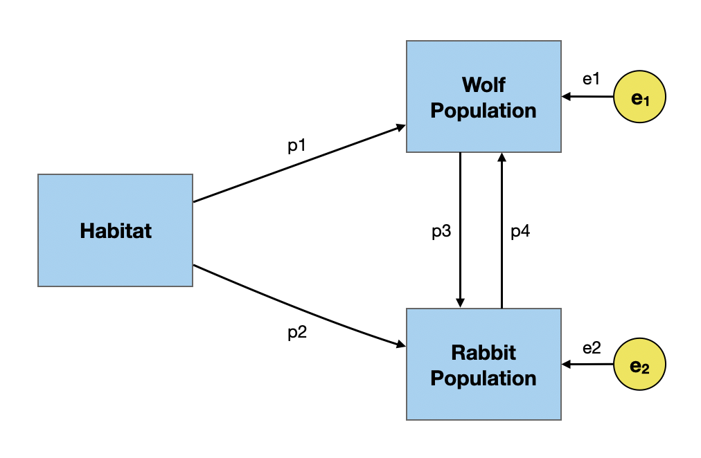 The problem with estimating the path coefficients in the non-recursive model is it is under-identified. In our predator–prey model, we need to estimate four path coefficients, but only have three correlations (equations) from which to do so. We can’t solve this without adding additional constraints!