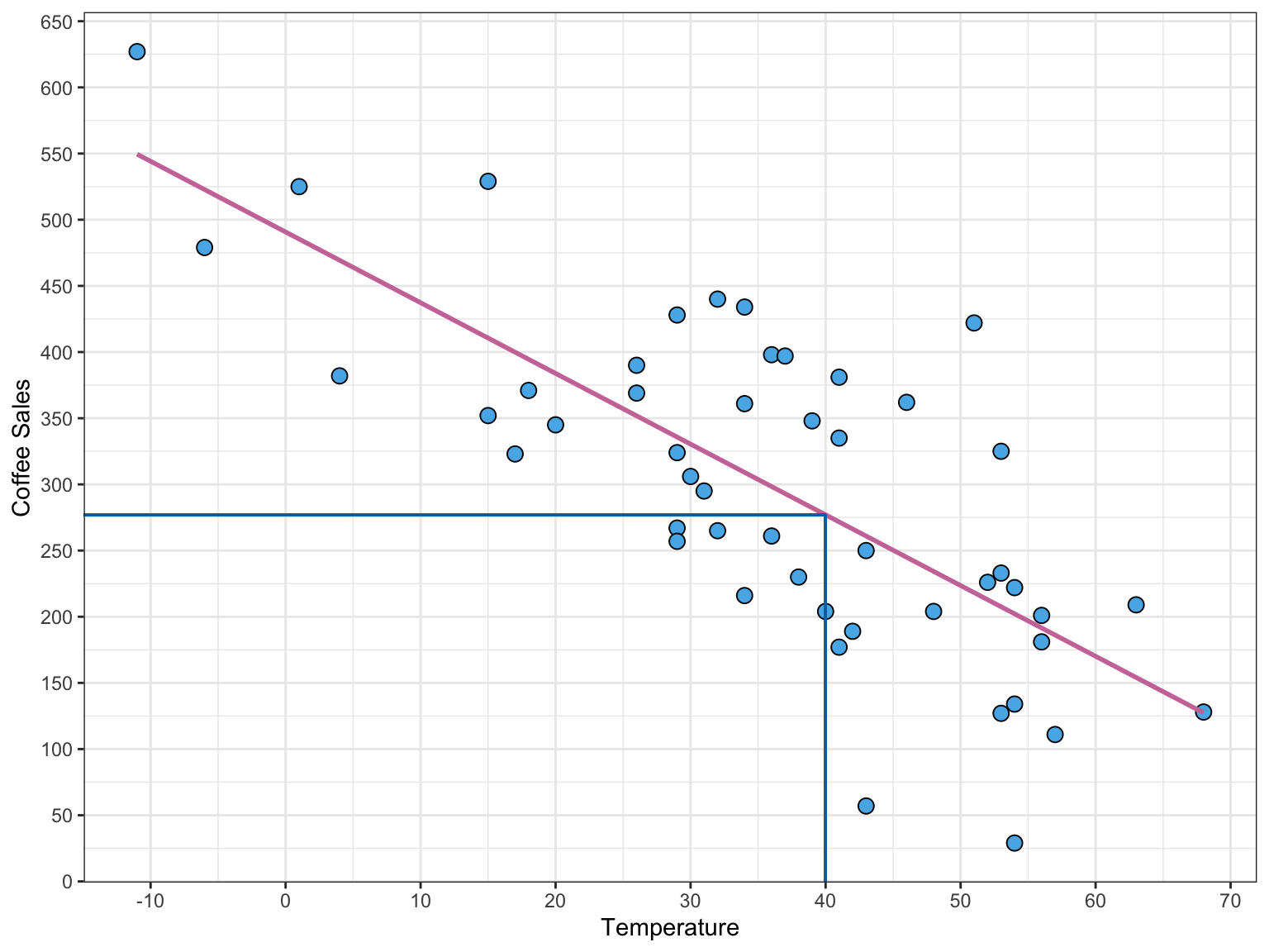 \[ \widehat{\text{Coffees}} = 491 - 5.3(\text{Temperature}) \]